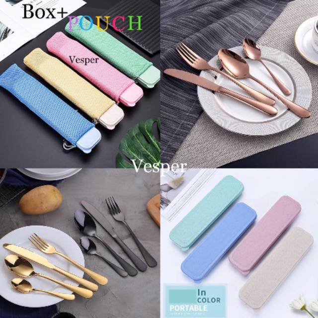 Paket alat makan free box Terdiri dari 1pcs sendok 1pcs garpu 1pcs sendok teh 1pcs pisau1pcs boxWarna alat makan yg tersedia Silver Rosegold Gold Black Purple BlueRainbow Harap cantumkan warna saat pemesanan jika tidak kirim ra