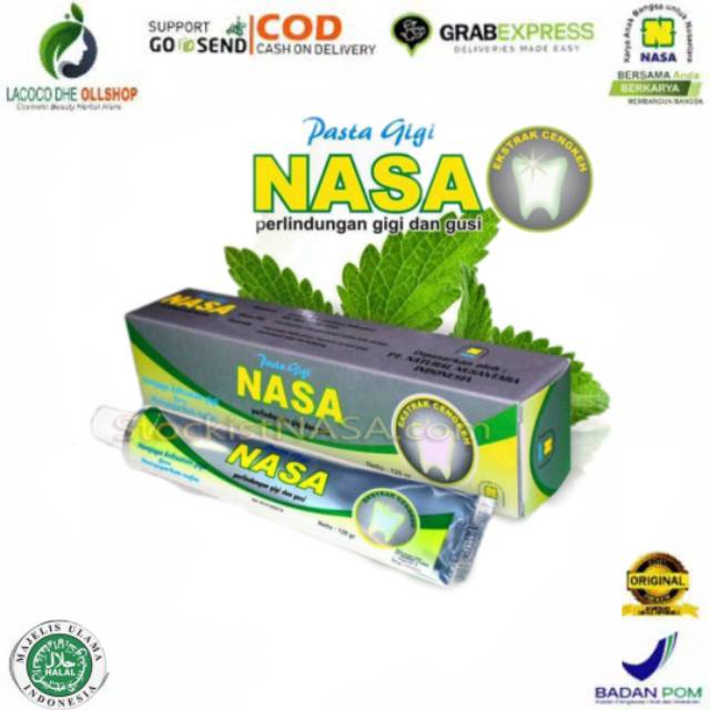 Terimakasih Telah Berkunjung di Lacoco Dhe Olshop, Seluruh Produk Yang Kami Jual Asli Original NASA.Lacoco Dhe Olshop Merupakan Official resmi dari PT. Natural Nusantara (NASA) yang menyediakan produk-produk terbaik untuk kesehatan, kecantikan, serta produk-produk untuk perkebunan, pertanian, perikanan & peternakan.Pasta Gigi NASA merupakan pasta gigi herbal yang mengandung minyak aroma alami yang memiliki rasa dan bau yang segar. Dengan memakai pasta gigi ini, menjadikan mulut menjadi harum dan menghilangkan bau tak sedap, serta mengandung Zat anti pembusukan (Anti decay-agent), yang mampu menurunkan jumlah bakteri di mulut dan mencegah proses pembusukan.Kandungan dan Manfaat Pasta Gigi NASA1. Mengandung Antibacterial acids yang berfungsi untuk membunuh bakteri, mencegah infeksi dan menghentikan pendarahan pada gusi.2. Kandungan Klorida, Pottasium, Fluoride, Silika, Sodium Bicarbonate, Sulfur, Trimethyl amine, Vitamin C, Salvadorine dan Tannins serta beberapa mineral lainnya yang berfungsi untuk membersihkan gigi, memutihkan dan menyehatkan gigi dan gusi.24 JAM MEMBERIKAN PERLINDUNGAN TERHADAP GIGI DAN GUSI SECARA MENYELURUHGambar Pasta Gigi Herbal