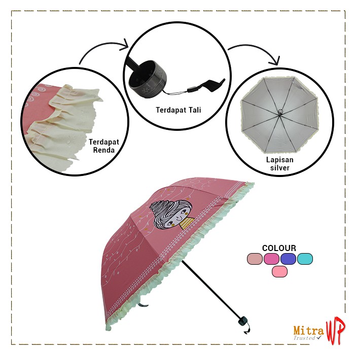Deskripsi Payung Lipat 3 Renda Renda Unik (Free Bubble wrap)Payung Lipat 3Detail:Diameter 90cmpanjang kondisi buka :65cmpanjang kondisi lipat 3: 25cmModel: Mangkok +renda rendaLapisan : SilverMotif :lady salonTersedia warna :ungu,violet,hijau mudah, pinkwarna:violethijaumerahbirupinkungucatatancantungin keterangan warna yang mau dibeli serta warna alternatif blla warna yang dipilih lagi kosongterima kasihmitr